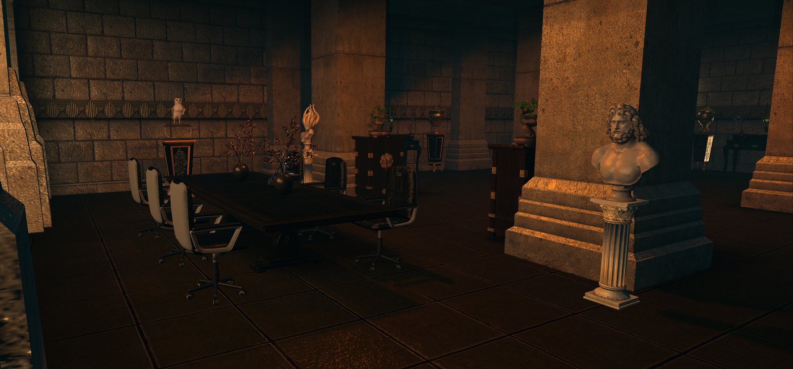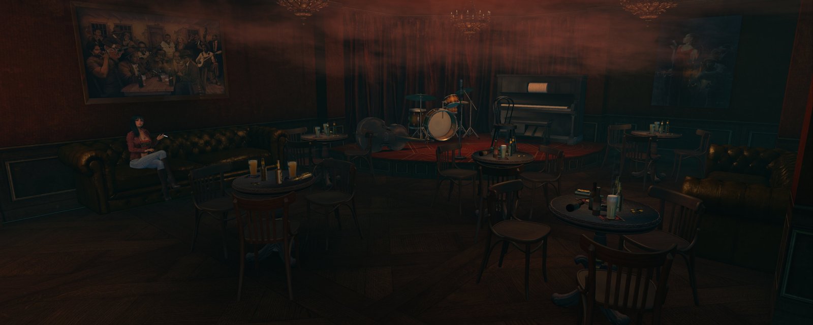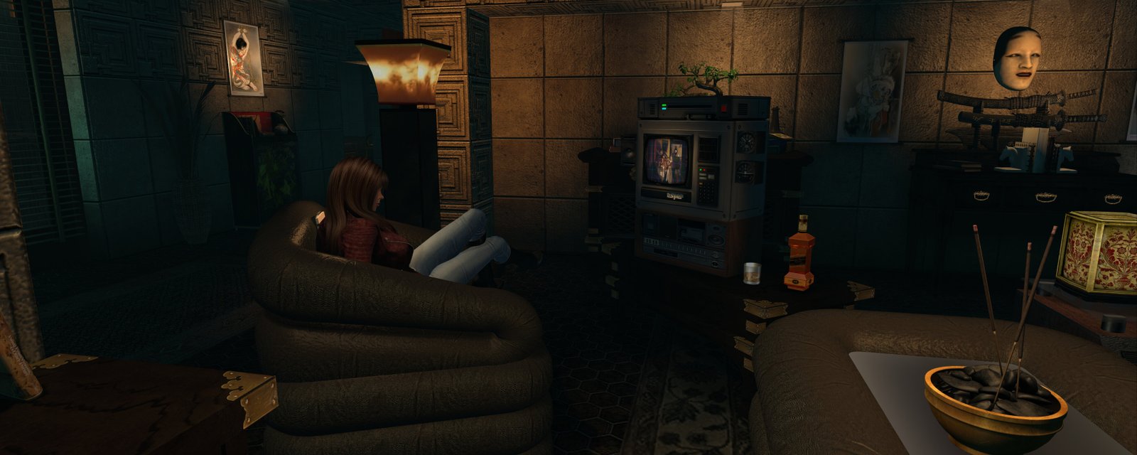 When you enter the sim you rezz in a skybox. A large notice on the wall advises you to use the Shared Environment for your EEP (formerly WindLight), to turn on sound, and to turn on music. I really recommend doing all of these as they have all been expertly crafted to give a great ambiance.