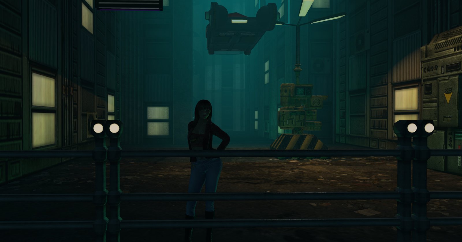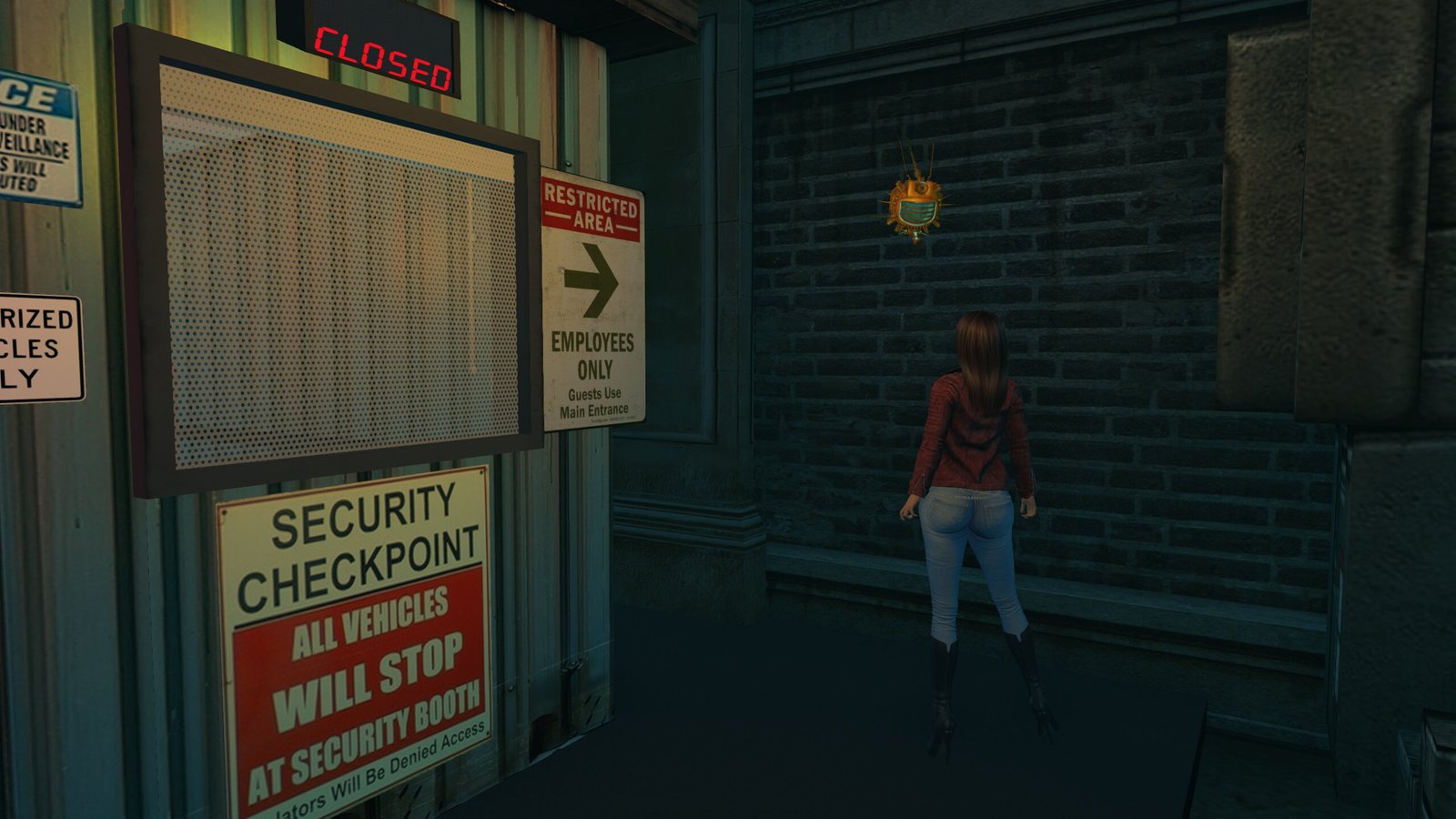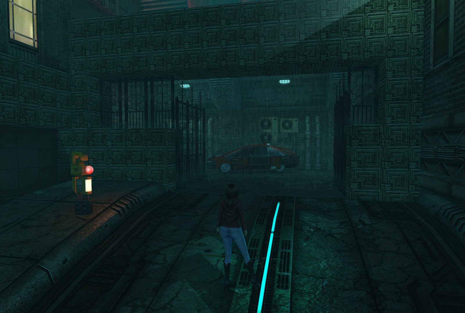 Back up and towards the gate to the Tyrell building. But what’s this? An energy barrier? BZZZZT! But we can go round to the right.