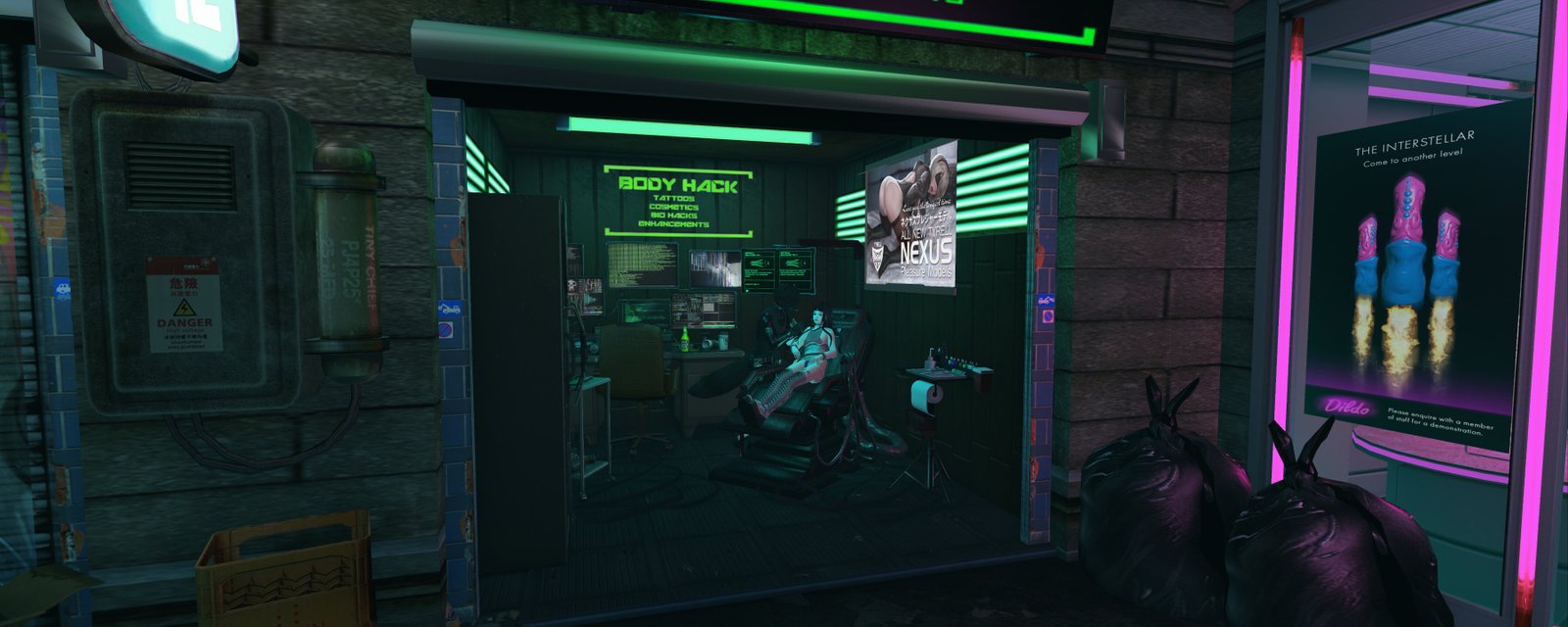 Moving down the alley on the right, and we find a place doing “Tattoos, Cosmetics, Bio Hacks, and Enhancements”.