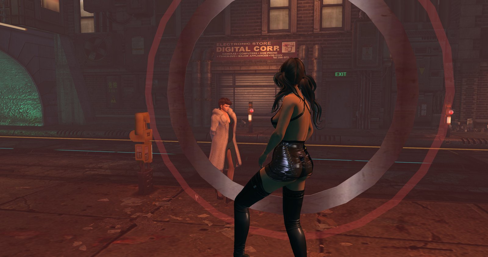 [Slight narrative break here. That is not Miss Salome. That’s Rug Halberd doing a little RP. She and I were friends years ago but in late 2013 / early 2014 we sort of drifted out of contact and eventually ended up defriended. Probably a cull with no hard feelings. It was absolutely amazing to just bump into her out of the blue like this and we reconnected and re-friended, which was lovely. The person out on the pavement with me is my friend CarCar who was with me at the time.]