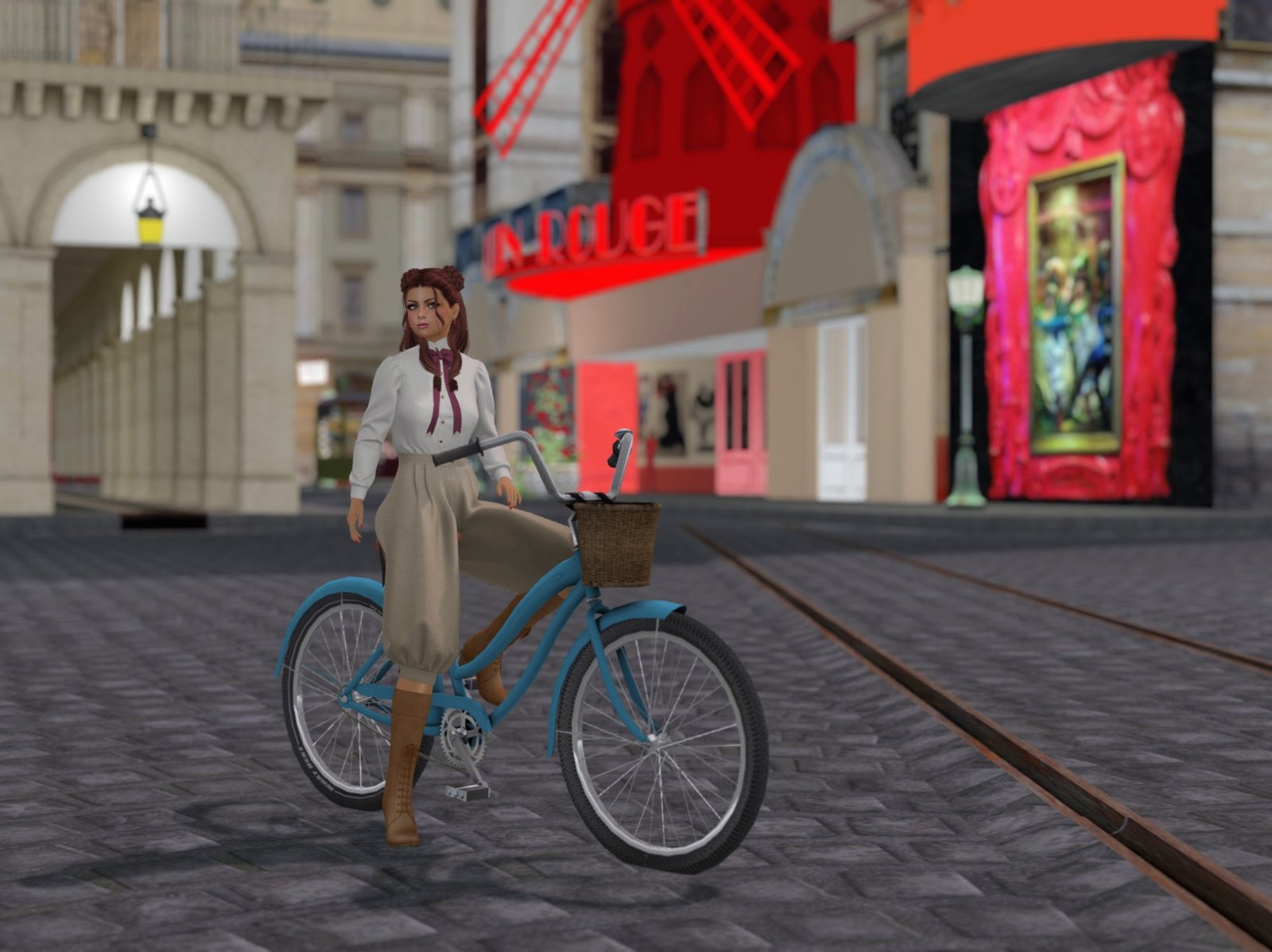 Where to go for a backdrop? My first thought was the Paris 1900 sim, even though the bicycle is more of a 1950’s style, although I would say the outfit is much earlier. I chose the famous Moulin Rouge as the backdrop.