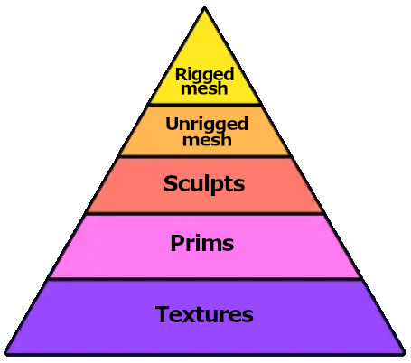 Nor is this situation looking likely to improve. As mentioned in my previous blog entry, Linden Lab have decided to go down the path of using collision bones for their Fitted Mesh project. Whilst this is a technically simpler and, some may say, more elegant solution to mesh clothing deformation, it makes the task of rigging mesh even harder for content creators, thus making that top tier of the pyramid even harder to reach.
