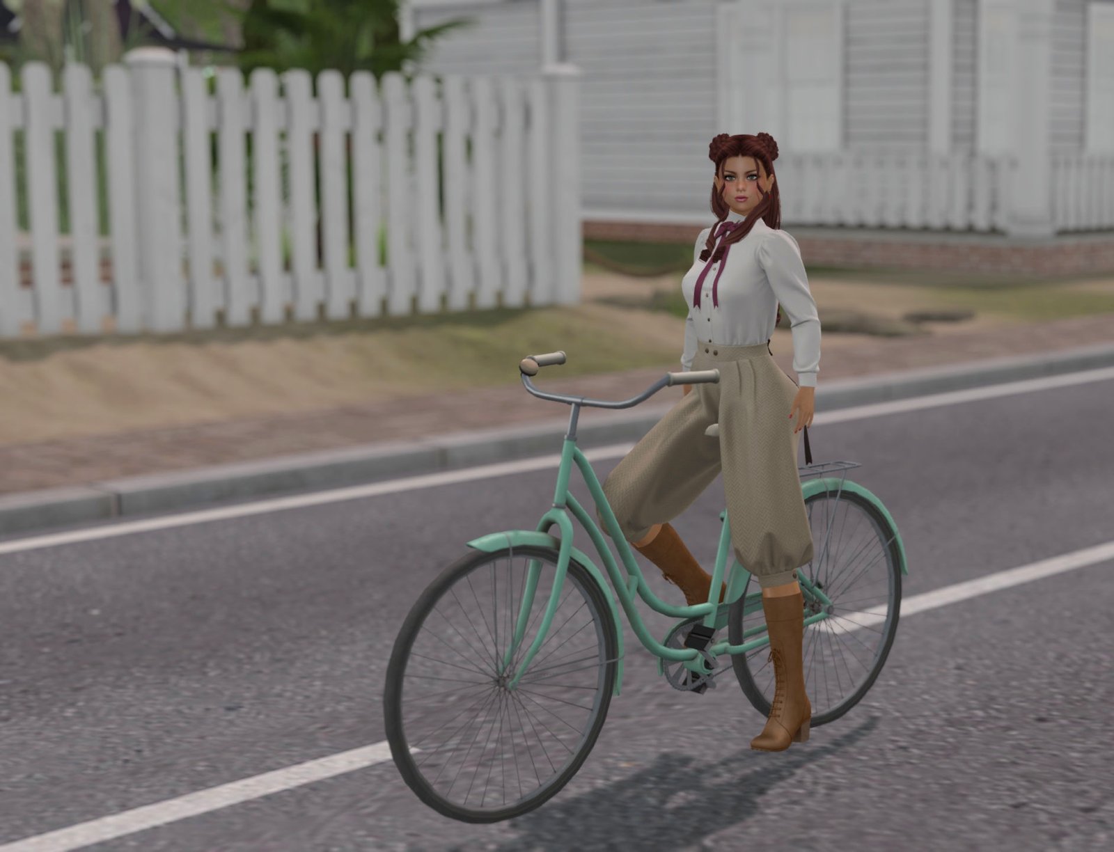 Where to go for a backdrop? My first thought was the Paris 1900 sim, even though the bicycle is more of a 1950’s style, although I would say the outfit is much earlier. I chose the famous Moulin Rouge as the backdrop.
